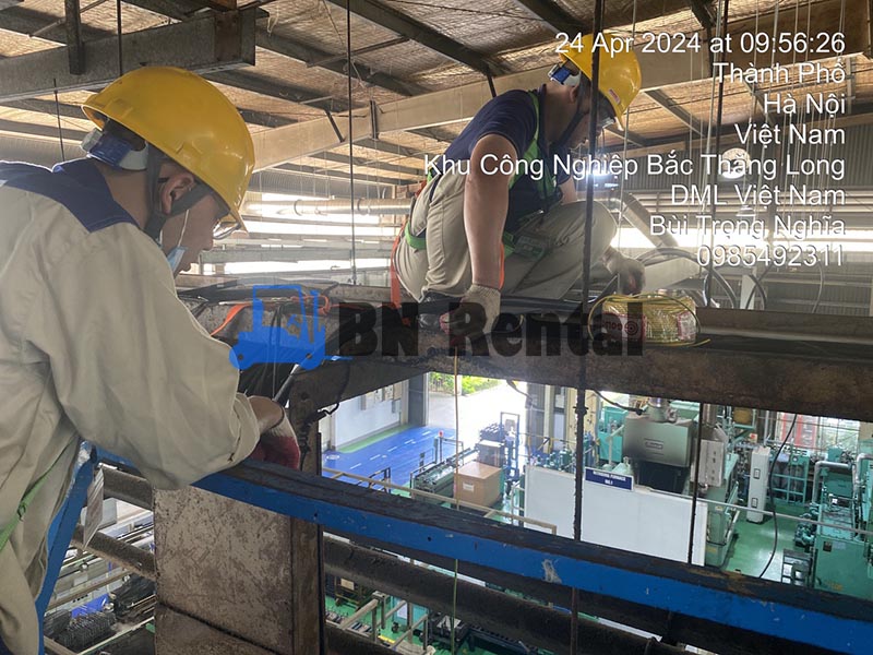 - Mặt bằng thi công: Nếu lắp đặt máy trên nền bê tông và không vướng gì thì đó là điều kiện đẹp nhất trong nghề lắp máy tuy nhiên thực tế thì không phải vậy. BN Rental liên tục nhận những đơn hàng lắp đặt dây chuyền máy ở các dự án mới nơi chưa có mặt bằng đẹp hay trong những nhà máy đã đi vào sản xuất nên nền bãi chật hẹp vướng đủ thứ và di chuyển máy móc nhân lực vào rất khó